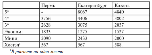 Различия в ориентации гостиничного бизнеса Перми, Екатеринбурга и Казани проявляются в ценах на услуги. Максимальная средняя цена на один номер оказалась в Екатеринбурге – 3320 руб./сутки. В Перми стоимость номера 2603 руб., это чуть выше, чем в Казани (2436 руб.).