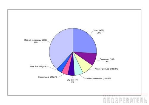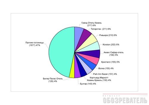 В Екатеринбурге половину рынка делят 7 крупнейших гостиниц. В Казани – самый высокий уровень конкуренции отелей: рынок поделили несколько примерно равных гостиничных комплексов.